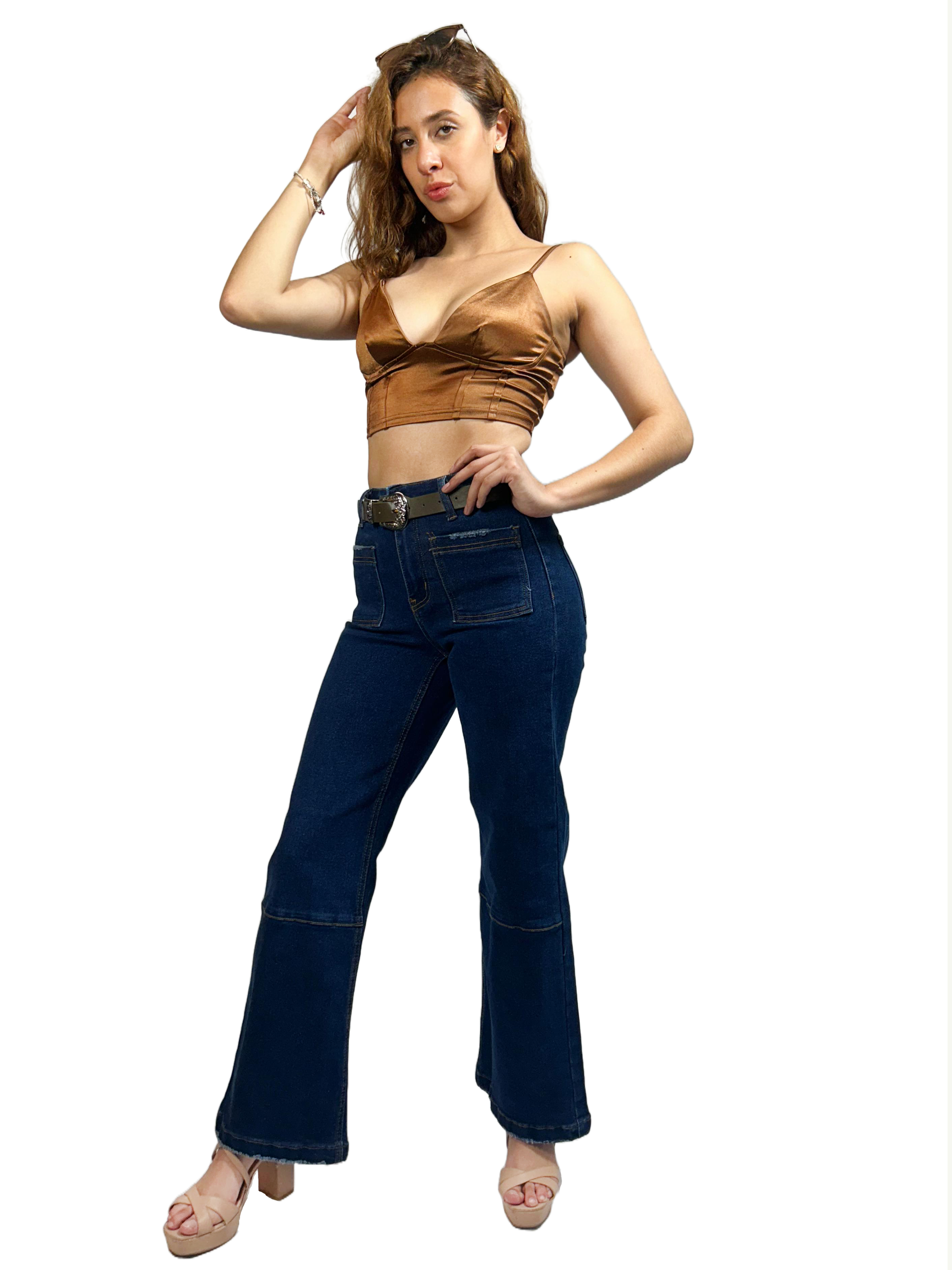 Pantalón de mezclilla stretch para mujer corte campana, es ideal para mujeres que buscan comodidad y estilo. Confeccionado en mezclilla de alta calidad, este pantalón de corte campana, tiro alto y pinzas levanta pompas realza la figura femenina.